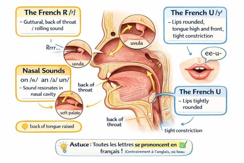 The Golden Rule of French Pronunciation: French has MANY sounds that don’t exist in English, but once you learn the patterns, they’re always consistent. French is actually MORE regular in pronunciation than English!